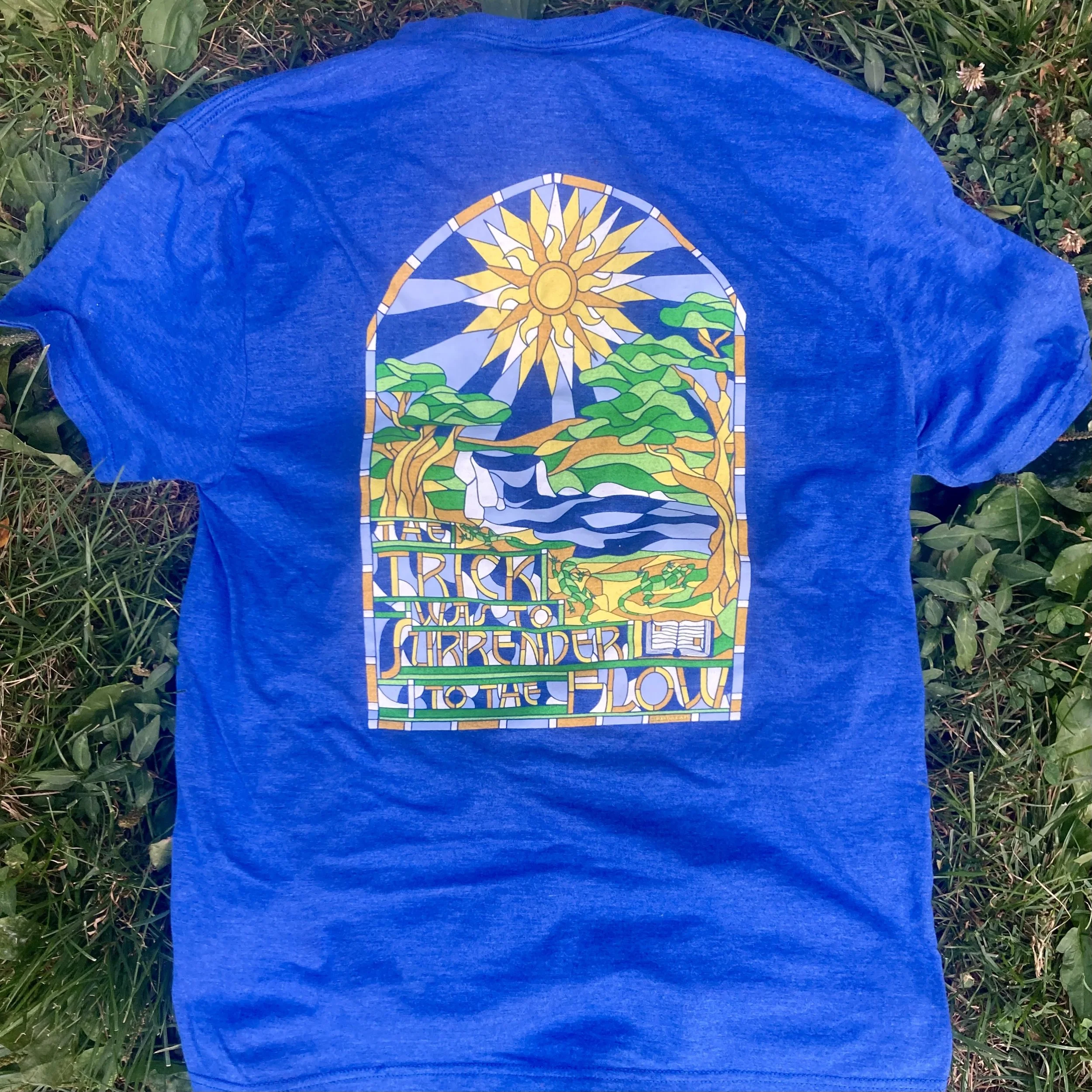 Royal blue colored shirt with 6-color screen print design.